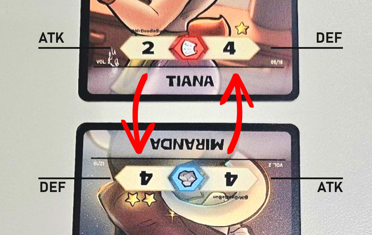 Whoever has to attack first has to count anti-clockwise (starting from your right).If your attack is equal or higher than the opponent's defense, then you win the round! Take your card and the opponent's card as well and place them both on your side in a discard pile and move onto a new card.If your attack is below the opponent's defense, then your turn goes to the other player.If the opponent's attack is still lower than your defense, then it's a draw, both of your cards have to go on each player's side and move onto the next card.NOTE: Because the cards are going to be mixed, it is heavily recommended to use card sleeves, so each player will recognise which card is who by the end of the game.